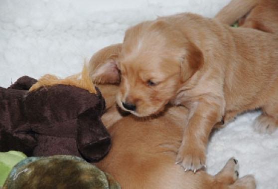Tara, die selbstbewusste Hündin in unserem Rudel, zeigt schöne Arbeitsanlagen, sie schleppt immer etwas umher. Das Rudel wird durch Tara, ihre Halbschwester Uma und Tara's Tochter Vinnie, gern aufgemischt. Es ist ein Vergnügen mit den dreien spazieren zu gehen und sie beim Toben und Spielen zu beobachten. Tara apportiert sehr gern, ist sehr gehorsam mit einem gesunden Selbstbewustsein. Sie hat einen tollen Ausdruck, einen kräftigen Körperbau und eine sehr gute Fellanlage. Sie hat viel Farbe - ein typischer Golden eben. Es wird Tara's zweiter Wurf sein. Tara hat mit den nachstehenden Ergebissen die besten Voraussetzungen für eine vorzügliche Zuchthündin, wir setzen große Hoffnung auf unsere Tara und ihre Nachkommen.